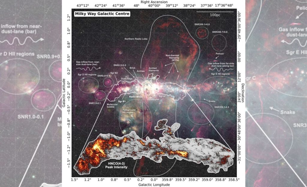 Dalam mosaik yang baru disusun ini, untaian panjang gas dingin terlihat menenun melalui pusat Bimasakti dalam jalur-jalur yang padat dan saling tumpang tindih. Melalui pandangan menyeluruh ini, Steve Longmore dari Liverpool John Moores University (LJMU) berhasil melacak bagaimana jalur-jalur tersebut mengumpul menjadi simpul-simpul yang lebih padat di dekat lubang hitam, sembari membentang hingga puluhan tahun cahaya di seluruh wilayah tersebut.