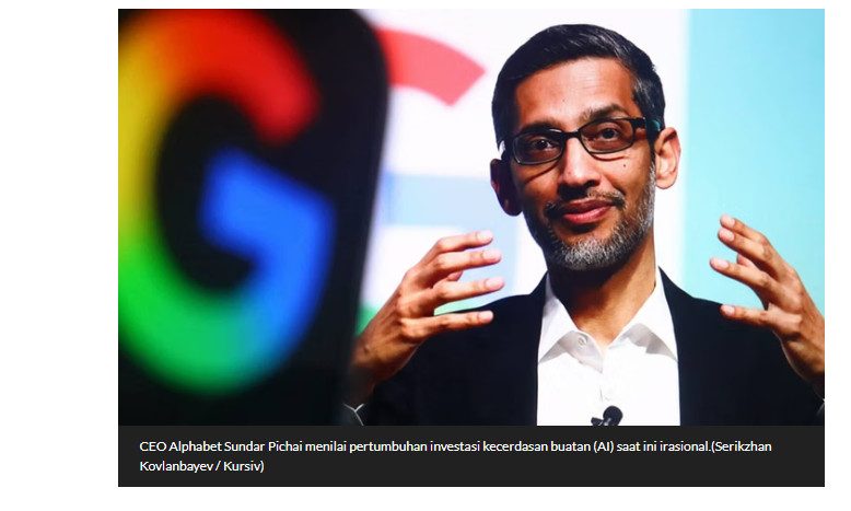 CEO Alphabet Sundar Pichai menilai pertumbuhan investasi kecerdasan buatan (AI) saat ini irasional.(Serikzhan Kovlanbayev / Kursiv)